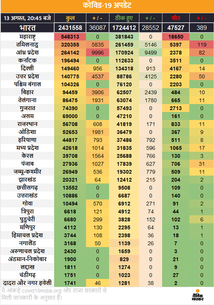 देश में कोरोना मरीजों का आंकड़ा 24 लाख के पार हो गया है। अब तक 24 लाख 31 हजार 558 संक्रमित पाए जा चुके हैं। राहत की बात है कि इनमें 17 लाख 22 हजार 993 लोग ठीक भी हो चुके हैं। 47,488 मरीजों की मौत हो चुकी है जबकि 6 लाख 58 हजार 783 मरीजों का अभी इलाज चल रहा है।