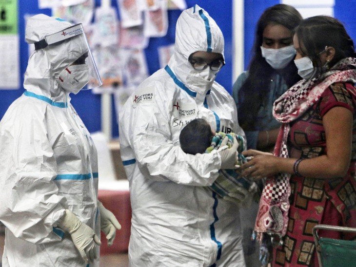 फोटो दिल्ली के सीडब्ल्यूजी कोविड केयर सेंटर की है। यहां एक संक्रमित महिला ने बच्चे को जन्म दिया। पीपीई किट पहने स्वास्थ्यकर्मी बच्चे को चेक करते हुए।