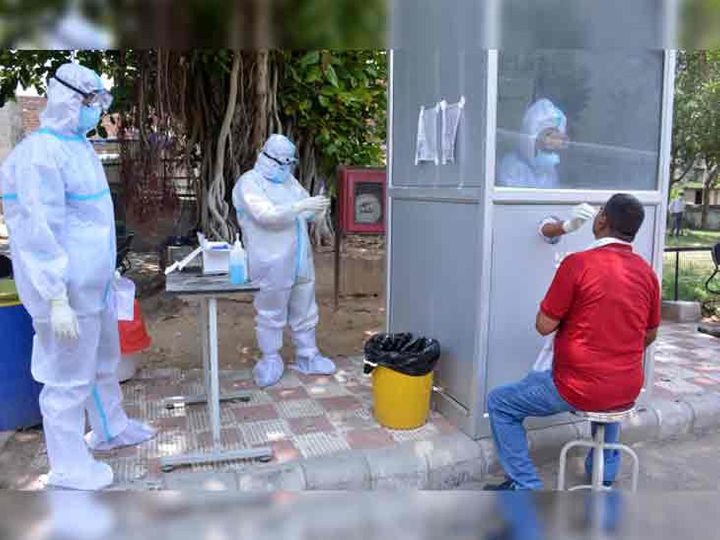 कोरोना जांच के लिए एक व्यक्ति का सैंपल लेते हुए डॉक्टरों की टीम।