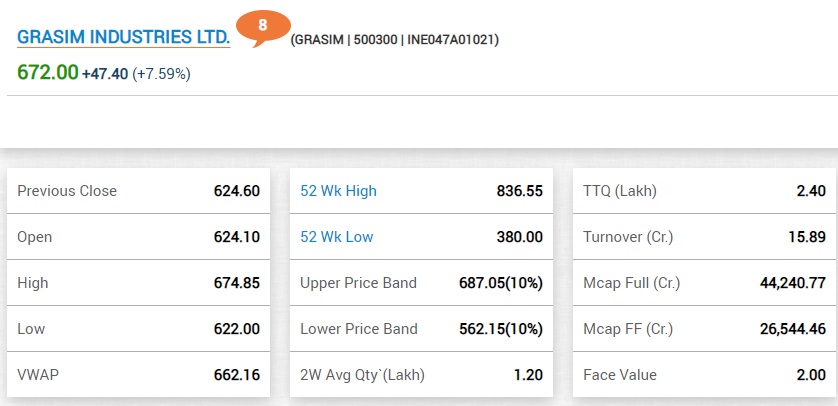 12:02 PM ग्रासिम के शेयर में 8% की बढ़त है।