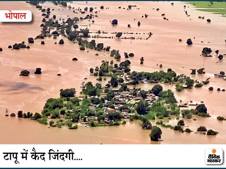 रविवार सुबह 10 बजे हेलीकॉप्टर से ली गई यह भोपाल के नसरुल्लागंज के गांव सातदेव की है। 5000 की आबादी वाला नर्मदा किनारे बसा यह गांव बाढ़ के पानी में घिरकर टापू बन गया है। एनडीआरएफ और सेना ने 80% आबादी को रेस्क्यू कर टीगाली गांव में शिफ्ट कर दिया है।