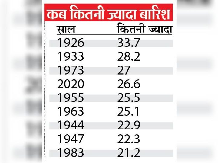 (अनिरुद्ध शर्मा) इस बार अगस्त में सामान्य से 26.6 फीसदी ज्यादा बारिश हुई है। बीती एक सदी में यह चाैथी बार है जब अगस्त इतना भीगा है। इससे अधिक बारिश केवल 1926 (33.7), 1933 (28.2) और 1973 (27) में हुई है। मौसम विभाग के मुताबिक सितंबर में इस वर्ष सामान्य से अधिक ही बारिश होने की संभावना है। यदि ऐसी हुआ तो इस बार के मानसून में 2019 और 1994 के बराबर यानी करीब 110 फीसदी बारिश की उम्मीद की जा सकती है। पूरे मानसून सीजन में यानी एक जून से 31 अगस्त तक कुल मिलाकर 110 फीसदी बारिश हुई है।