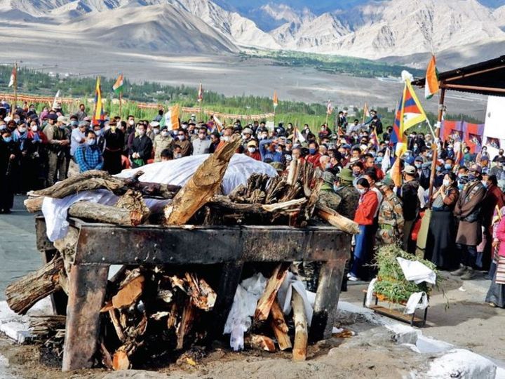 भारत-चीन बॉर्डर पर शहीद हुए स्पेशल फ्रंटियर फोर्स के कमांडो नाइमा तेनजिंग (51) का सोमवार को लेह में सैन्य सम्मान के साथ अंतिम संस्कार किया गया। इस दौरान लोगों ने तिरंगा थामकर भारत माता के जयकारे लगाए। नाइमा 29-30 अगस्त की रात चुशूल के ब्लैक टॉप पर चीन के खिलाफ ऑपरेशन के दौरान माइन ब्लास्ट में शहीद हुए थे। उन्हें श्रद्धांजलि देने भाजपा के महासचिव राम माधव भी पहुंचे।