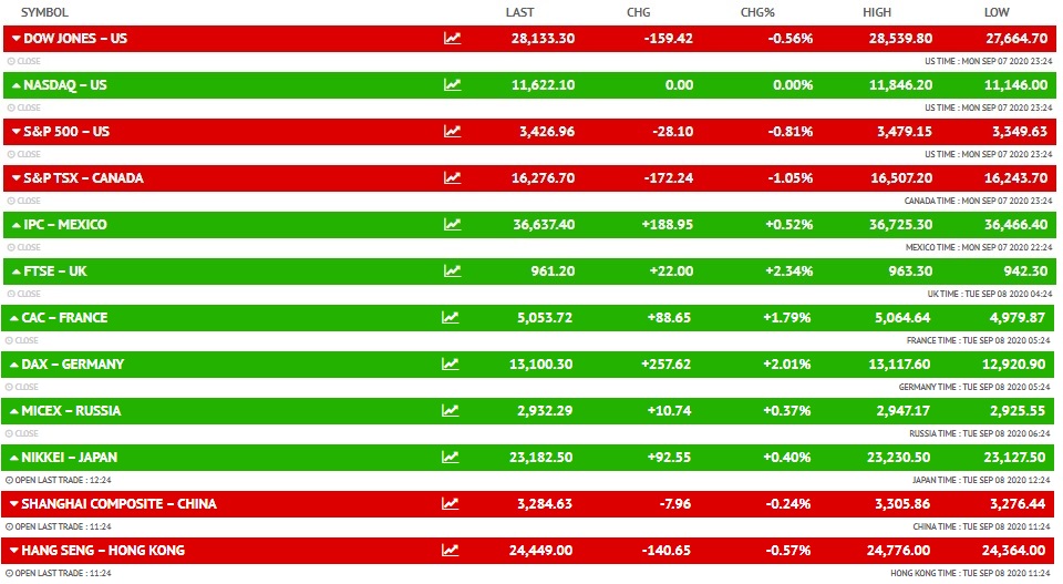 सोमवार को दुनियाभर के बाजारों में मिलाजुला कारोबार देखने को मिली। अमेरिकी बाजार डाउ जोंस 0.56 फीसदी की गिरावट के साथ 159.42 अंक नीचे 28,133.30 पर बंद हुआ था। वहीं, दूसरे अमेरिकी बाजार नैस्डैक में फ्लैट कारोबार रहा और इंडेक्स 11,622.10 पर बंद हुआ था। दूसरी तरफ, एसएंडपी 0.81 फीसदी गिरावट के साथ 28.10 पॉइंट नीचे 3,426.96 पर बंद हुआ था।