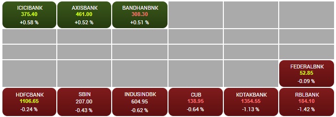 09:46 AM बीएसई बैंकेक्स में शामिल 10 कंपनियों के स्टॉक्स में से 7 में गिरावट और 3 में बढ़त है।आरबीएल बैंक के शेयर में 1.42 फीसदी की गिरावट है।
