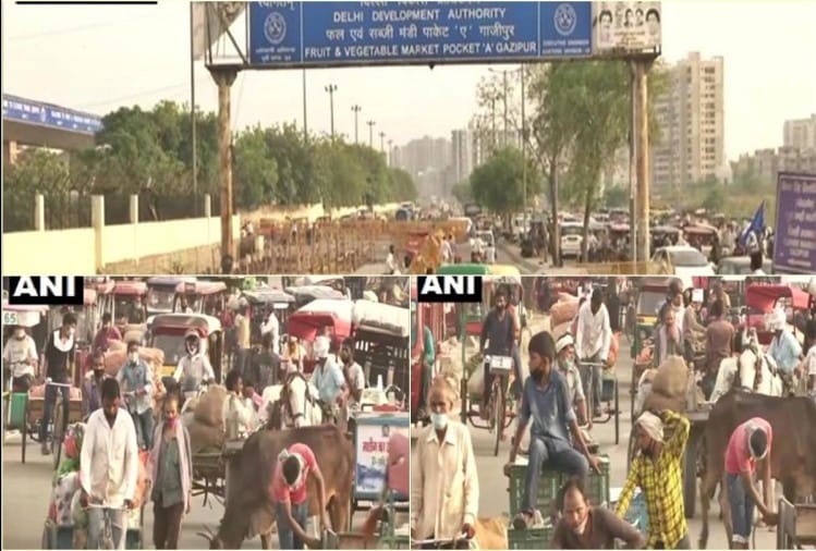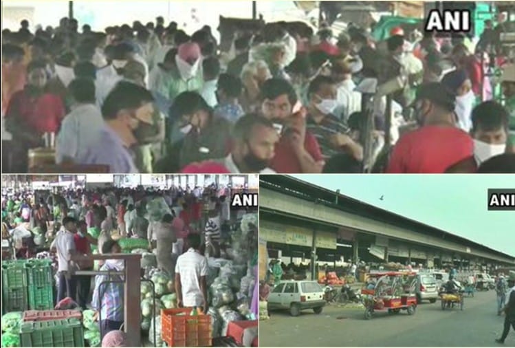 दिल्ली में बढ़ते कोरोना संक्रमण के बीच गाजीपुर सब्जी मंडी के बाहर खरीदारों की भीड़ नजर आई। यहां लोगों ने सामाजिक दूरी के नियमों का उल्लंघन किया।