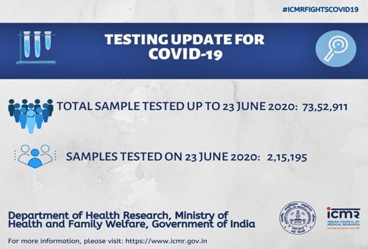 भारतीय चिकित्सा अनुसंधान परिषद (आईसीएमआर) की ओर से बताया गया कि 23 जून तक 73,52,911 नमूनों का परीक्षण किया गया है। जिसमें से पिछले 24 घंटे में 2,15,195 नमूनों का परीक्षण किया गया।
