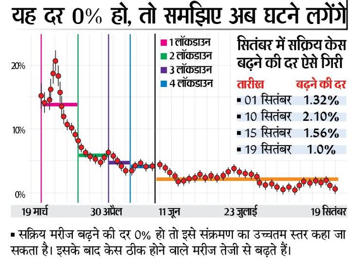 भारत में पहली बार काेराेना के सक्रिय मरीज बढ़ने की दर गिरकर 0.64% रह गई है। 19 सितंबर काे यह 1.0% थी। एक दिन में इसमें 0.36% की गिरावट हुई है। अब यदि यह दर नहीं बढ़ती है या स्थिर रहती है ताे सक्रिय मरीज 474 दिन में दाेगुने हाेंगे। यानी एक साल से भी अधिक समय में। लाॅकडाउन 1 के दाैरान अप्रैल में यह 22% थी। लाॅकडाउन 2 में यह गिरकर 5% तक आ गई थी। अनलाॅक 1 के दाैरान जून में यह 2.5% तक गिर गई थी। गिरावट का मुख्य कारण देश के रिकवरी रेट में सुधार हाेना है।