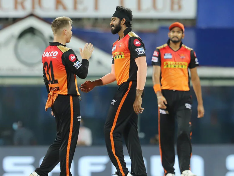 MI vs SRH Live Score: Vijay Shankar celebrates a wicket during IPL 2021’s Match 9.© BCCI/IPL