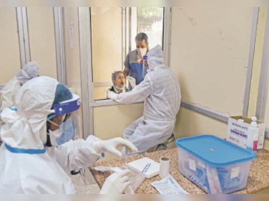 नई दिल्ली में रैपिड एंटिजन टेस्ट के लिए कोरोना का सैंपल लेते स्वास्थ्यकर्मी।