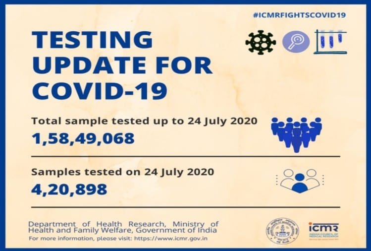 भारतीय चिकित्सा अनुसंधान परिषद (आईसीएमआर) की ओर से जारी आंकड़े के मुताबिक, देशभर में 24 जुलाई तक परीक्षण किए गए कोरोना नमूनों की कुल संख्या 1,58,49,068 है। जिनमें 4,20,898 नमूनों का परीक्षण शुक्रवार को ही किया गया है।