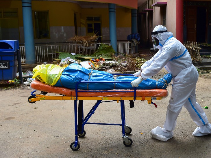 फोटो बेंगलुरु की है। संक्रमित मरीज की मौत के बाद उसके शव को अंतमि संस्कार के लिए ले जाता स्वास्थ्यकर्मी। बेंगलुरु में अब तक 917 लोग संक्रमण की चपेट में आकर जान गंवा चुके हैं।